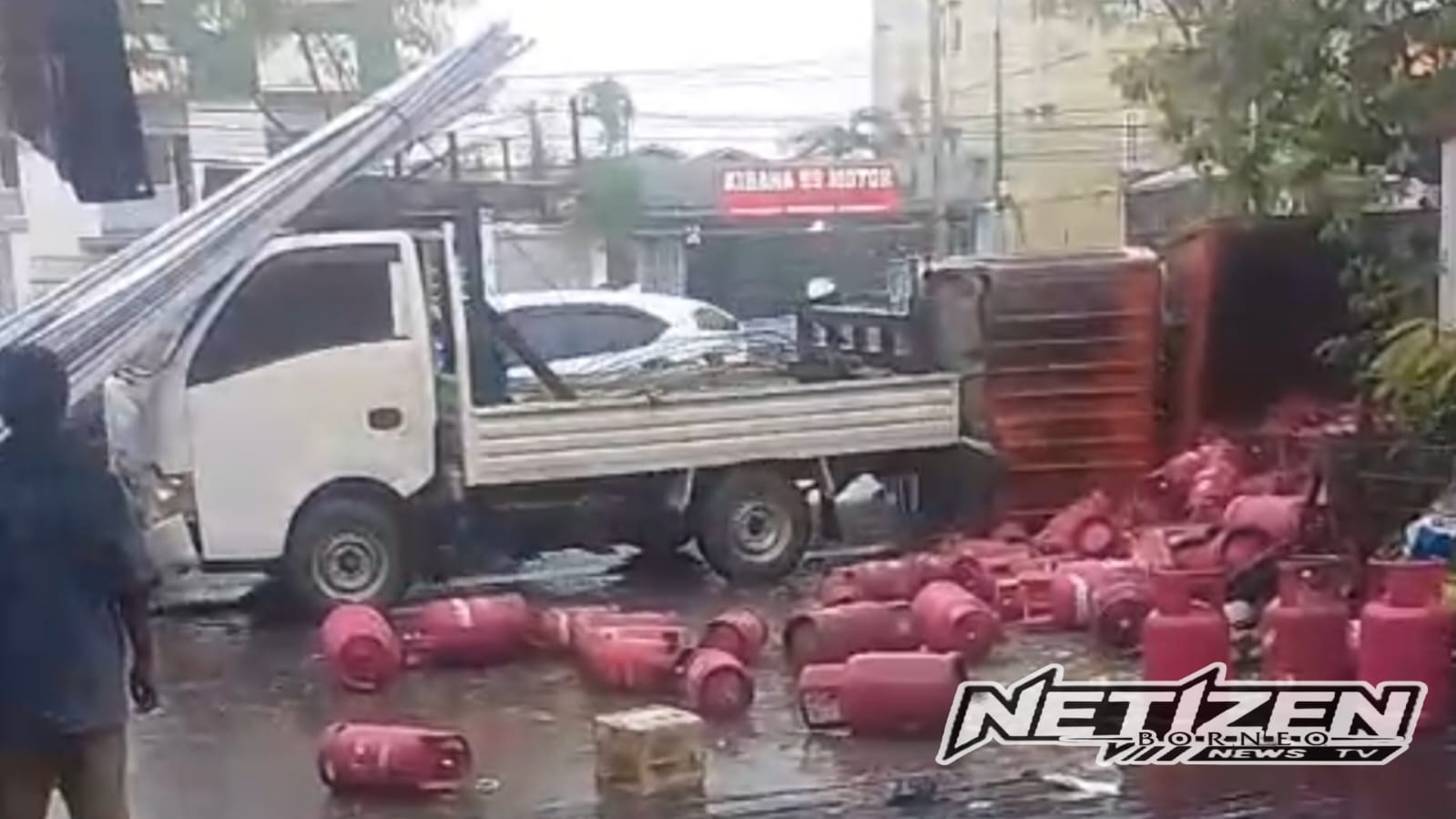 Selanjutnya, truk kehilangan keseimbangan hingga akhirnya terbalik di badan jalan. Pada saat yang sama, muatan tabung gas elpiji berhamburan dan berserakan di sekitar lokasi, sehingga menimbulkan kekhawatiran bagi pengendara yang melintas.