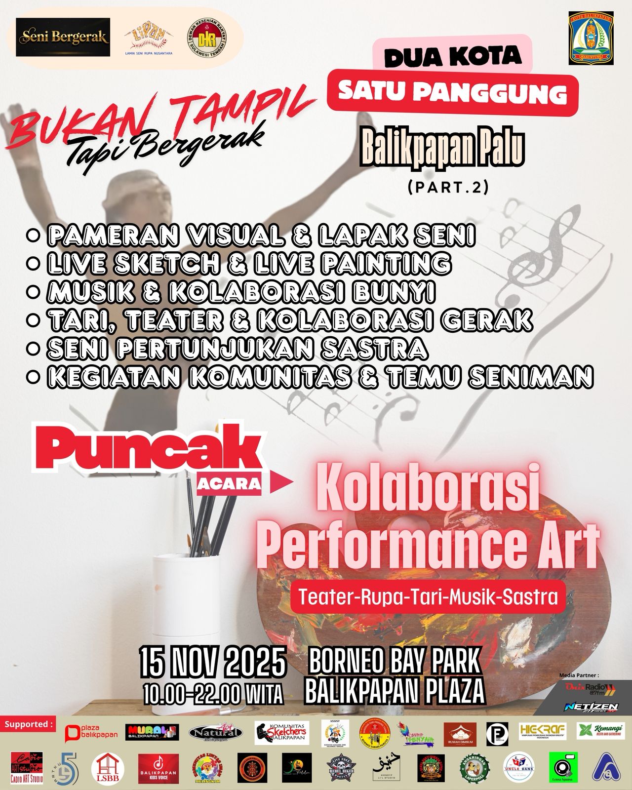 BALIKPAPAN — Lebih dari seratus seniman lintas disiplin dari Balikpapan dan Palu kembali bertemu dalam ruang kolaborasi bertajuk “Dua Kota Satu Panggung – Balikpapan x Palu (Part.2)”, Sabtu (15/11/2025) di Borneo Bay Park, Balikpapan Plaza.
