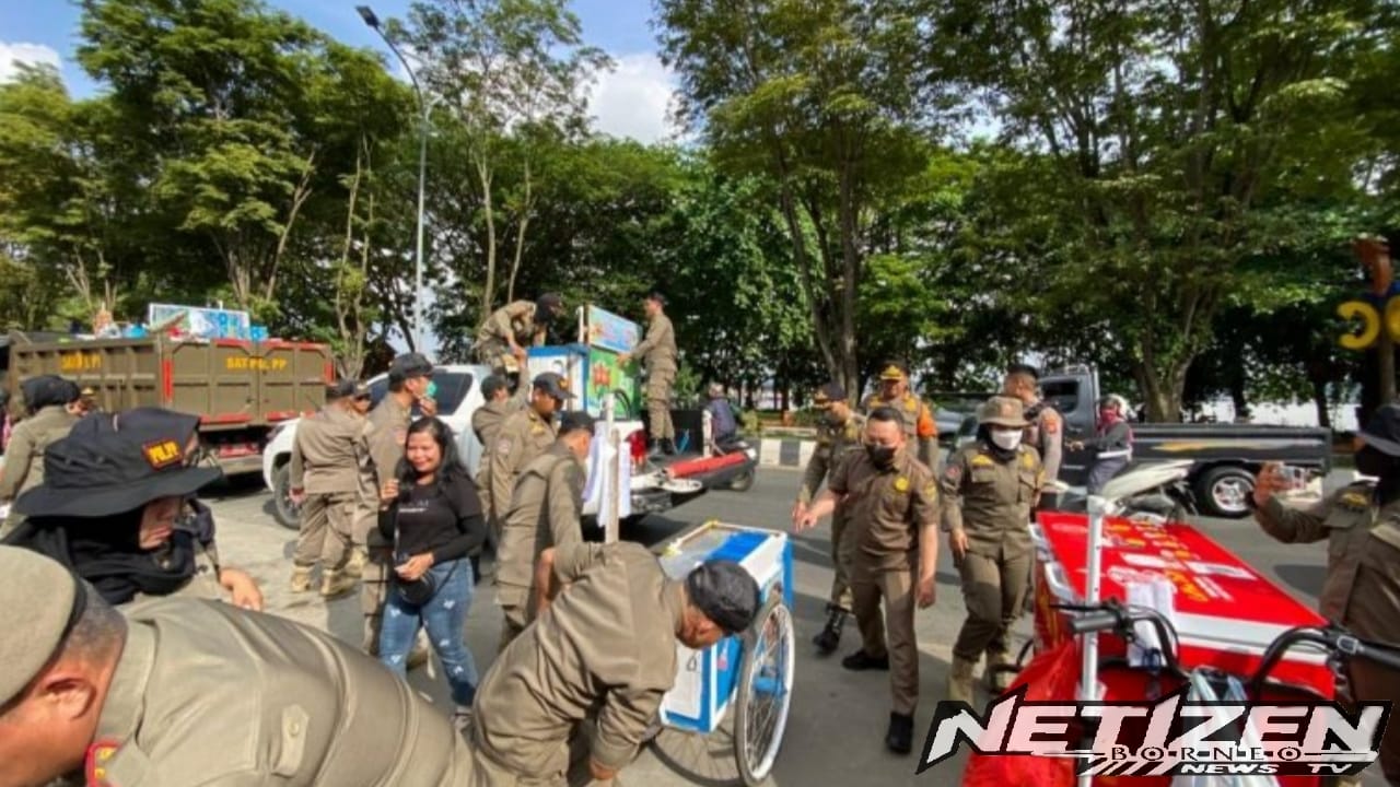 SAMARINDA — Petugas gabungan menertibkan delapan rombong pedagang kaki lima (PKL) di depan Masjid Islamic Center Samarinda, Jalan Slamet Riyadi, pada Selasa (4/11/2025) sore.