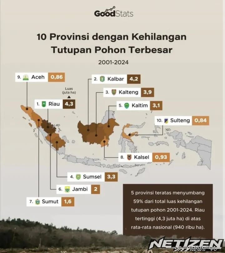 Secara nasional, lima provinsi teratas mencatat kehilangan lebih dari 19 juta hektare tutupan pohon. Skala kerusakannya sangat besar, setara hampir 70 persen luas Pulau Jawa. Bahkan, tiga provinsi Kalimantan—Kalbar, Kalteng, dan Kaltim—secara kolektif menyumbang hampir setengah total kehilangan tutupan pohon Indonesia.
